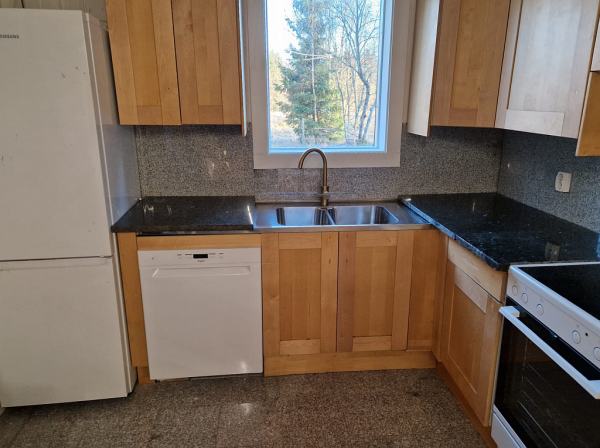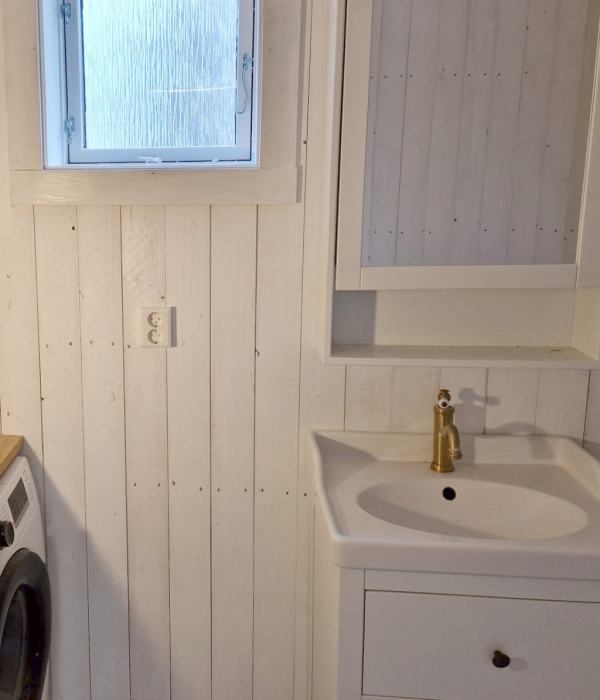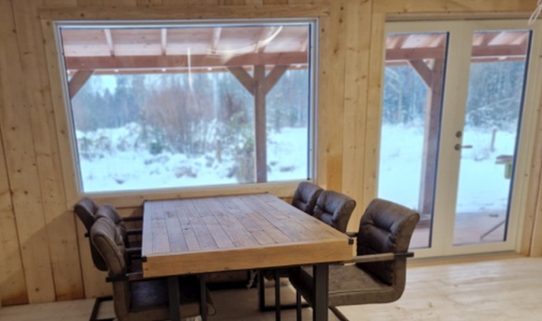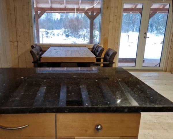 Älghagen has an open floor plan. which is a combined kitchen, livingroom and TV room. 3 bedrooms, wood stove and a leather sofas. There is a large dining table, which seats 6 people. Kitchen has black granite counters and white wood floor. Stove with oven, microwave, coffemaker, full size fridge and freezer and a dishwasher. The bathroom has a new shower and a washing machine.