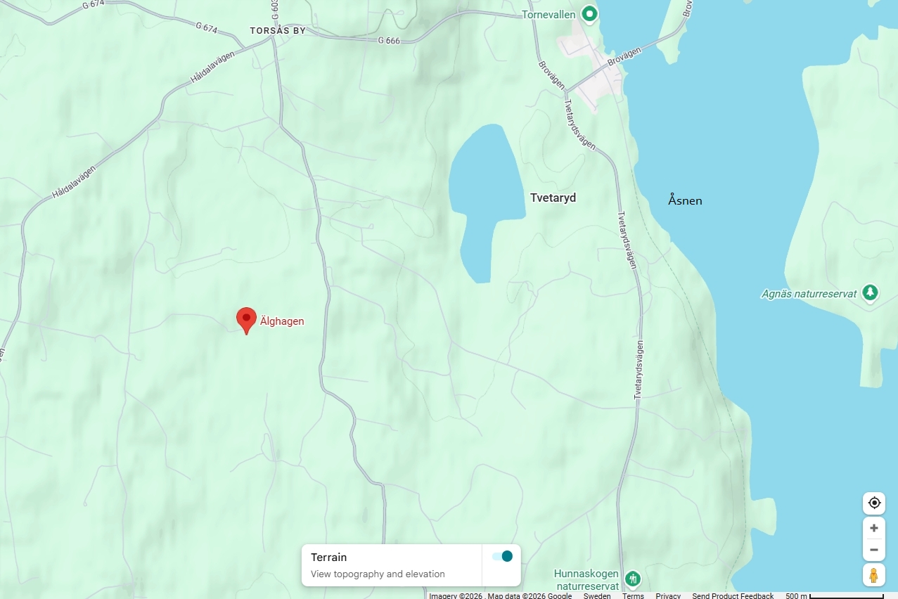 Älghagen is located 30km south west of Växjö, between Älmhult and Växjö. 5km to the Åsnen Runt Trail, 5km to Torne, 8km to Hulevik, 10km to Grimslöv, 13km to Huseby Bruk, 18km to Vislanda train station, 30km to Växjö, 31km to Alvesta train station, 47km to IKEA in Älmhult 80km to Glasriket: Kosta Boda, Orrefors and Nybro, 135km to Kalmar, 160km to Ullared, GeKås 168km to Helsingborg, 185km to Malmö. The closest grocery store is Tommys Livs ICA Affär in Lönashult and ICA Dackehallen in Vislanda. Larger grocery stores can be found in Växjö, for example: City Gross, Lidl, MAXI and WiLLY:S. Grocery stores in Älmhult: Lidl, MAXI and WiLLY:S. Shopping Mall in Växjö with 70 shops, cafe and restaurants: Grand Samarkand i Växjö. LEOS LEKLAND is located in Växjö. It is an indoor play ground for kids of all ages.